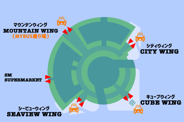 タクシーでSMシーサイドまで行くと、特に指定しない限りマウンテンウィングで降車となります。
